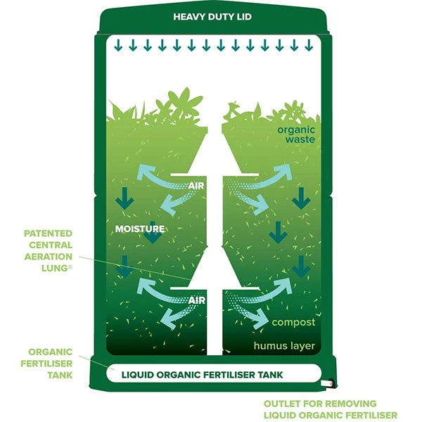 Patented Aeration Lung – fitted in the lower section of the Aerobin this self-aeration lung means you don’t have to turn the compost manually.