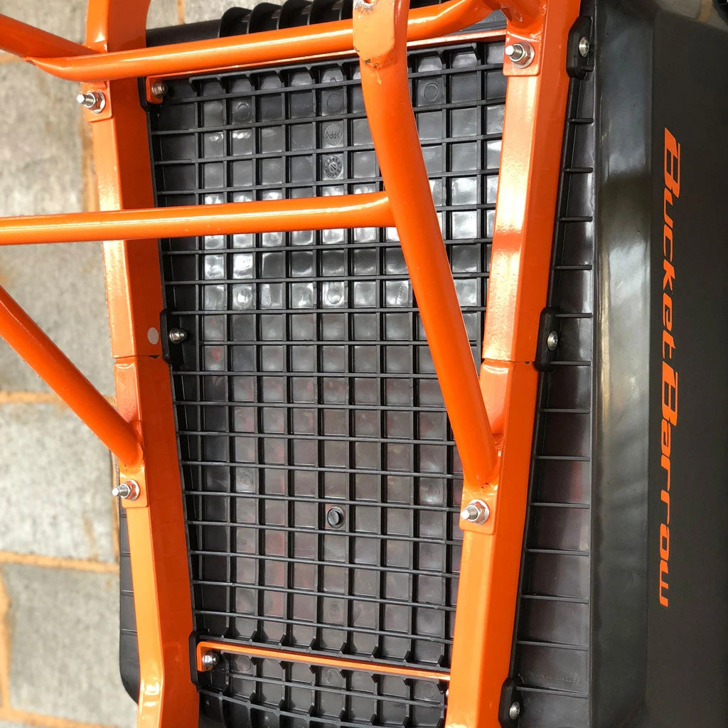 Strong, 88 litre waterproof tray – made from 5mm thick UV treated premium polypropylene helping to keep the overall weight of the wheelbarrow low at just 17.5kg. Specially moulded so that the bolts holding it to the frame of the wheelbarrow fit through heavy duty tabs built into the underside of the tray. Integrated into the tray is a shock board with strengthened ribbing.
