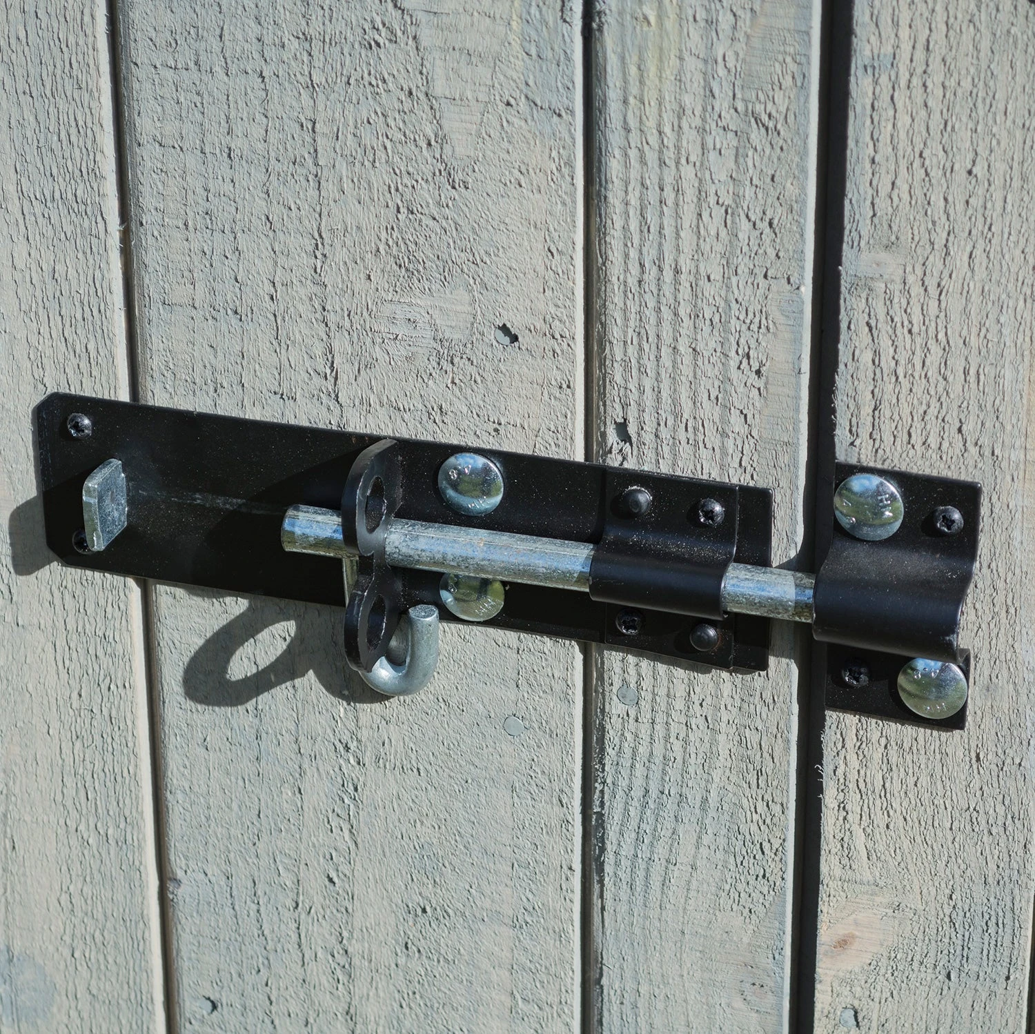 Single Hinged Door – with Z framing for strength and stability. Three large, T-hinges secure the door to the frame of the shed. A pad bolt on the front secures the doors closed – we recommend adding a padlock (not included) for added security. Door opening size : 5ft / 152.5cm high x 2ft 3½in / 69.5cm wide.