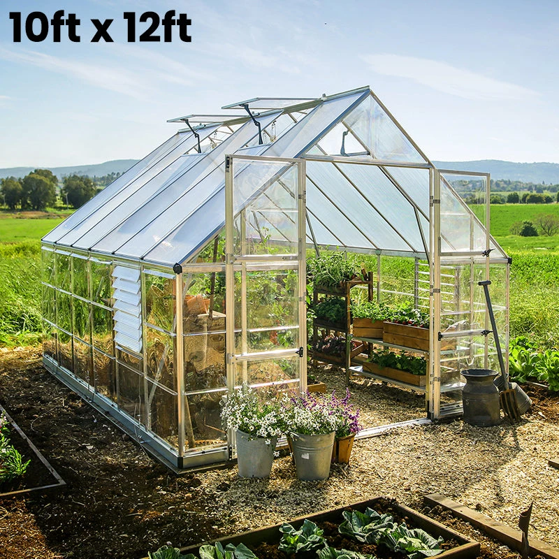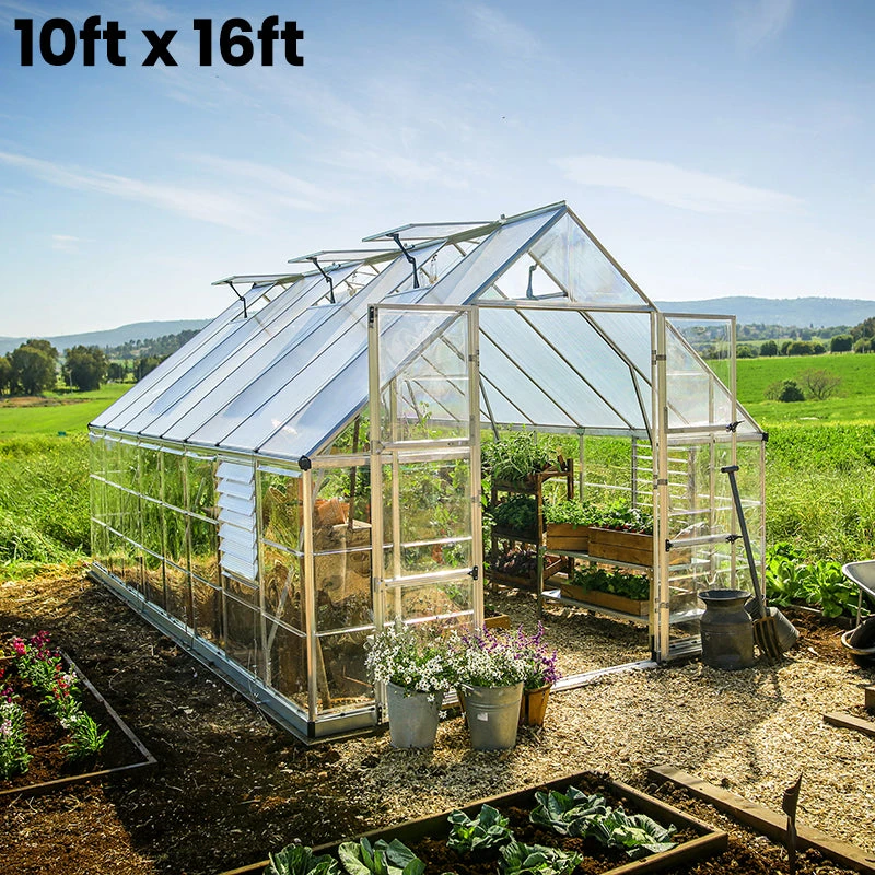 Heavy Duty Aluminium Frame – provides a highly durable, maintenance free, rust resistant and extra-rigid structure. For added strength this greenhouse features extra ridge brackets and extra support bars running from the roof to the sides of the greenhouse.