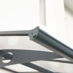 Sturdy Frame – manufactured from rust-resistant, aluminium and with durable, laser cut, galvanised steel support arms with a dark grey finish (RAL7016). A front aluminium gutter directs rainwater sideways.