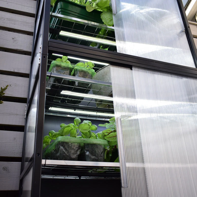 Four Season – the ultimate, all year round growing system this model includes lighting and an additional shelves so you can grow more in the same space. This model includes greenhouse with four shelves plus automatic opener for the roof, smart control system to connect to mains power, temperature sensor, irrigation kit with pump, two heating cables, eight 10watt LED strip lights, WiFi connectivity.