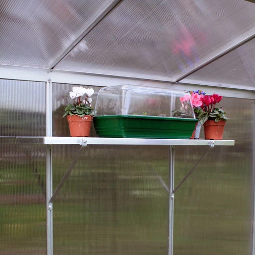 Trays – 7/8in (23mm) deep reversible gravel tray shelves can be used either as a flat shelf or reversed to hold gravel or water matting. 6in (15cm) wide trays are ideal for storing small pots and tools, 10in (25.5cm) wide trays neatly accommodate seed trays.