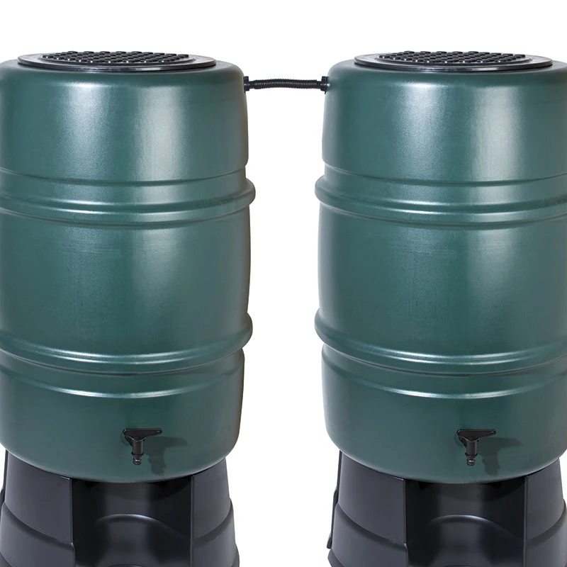 The water butts can be connected at the bottom – then the two water butts will fill at the same rate, or if the water butts are connected at the top (as shown) – then the first water butt will be filled to that level and then run over into the second water butt.